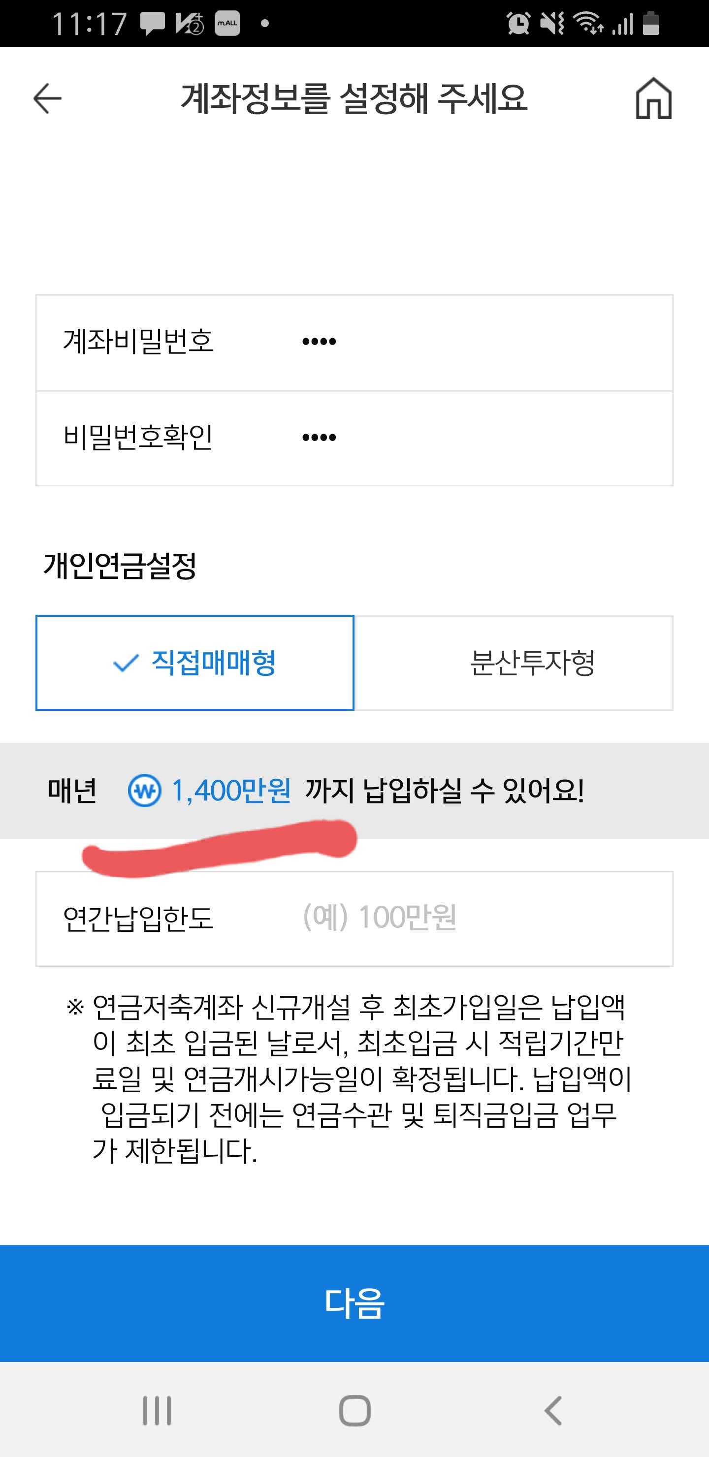 잽싸게 연간 납입 한도를 400만원으로 조정해주고 나니 그제서야 계좌신청이 정상적으로 된다.