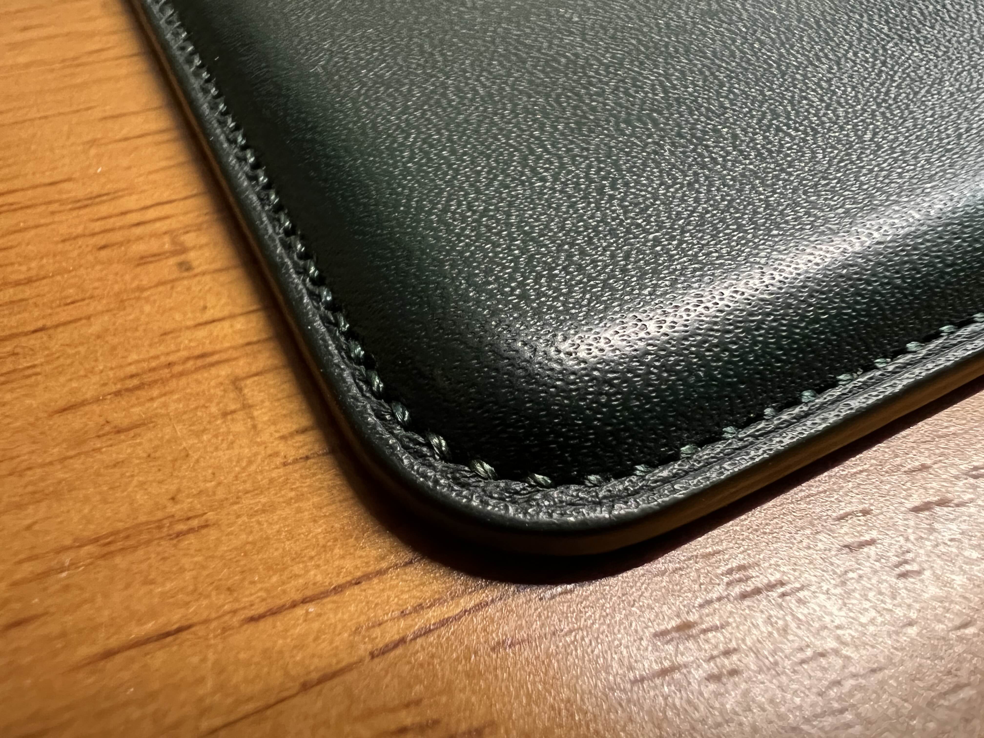 애플 정품 가죽지갑은 바느질이 엄청 촘촘하고 잘 되어 있다. 반면에 알리발 제품은 비교적 듬성듬성하다.