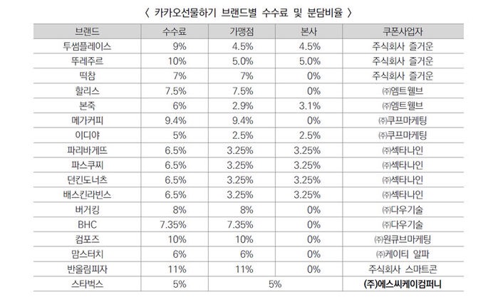 최근 기프티콘을 받아서 주문을 하게 되면 수수료를 얼마나 떼는지에 관한 자료가 공개되었다. 놀랍게도 본사 수수료 부담이 0%인 곳도 꽤나 있었다. 가맹점주들 입장에서는 빡쳐서 내 기프티콘 주문을 품절처리 했었나보다.