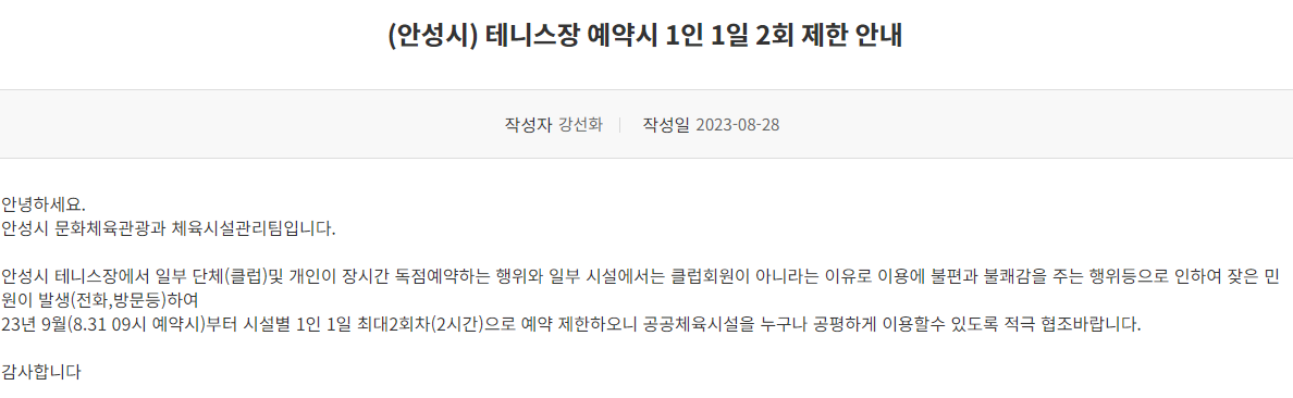 특히나, 안성시는 테니스장 대여가 (현재 기준으로) 굉장히 손쉬운 편이다. 개수도 많은데다가 심지어 무료다! 심지어 최근 8월에 금광테니스장이라고 새로 또 오픈도 했다. 이런 좋은 시스템이 있는 줄 잘 몰랐었다. 역시 세상은 아는 만큼 보이는 법.