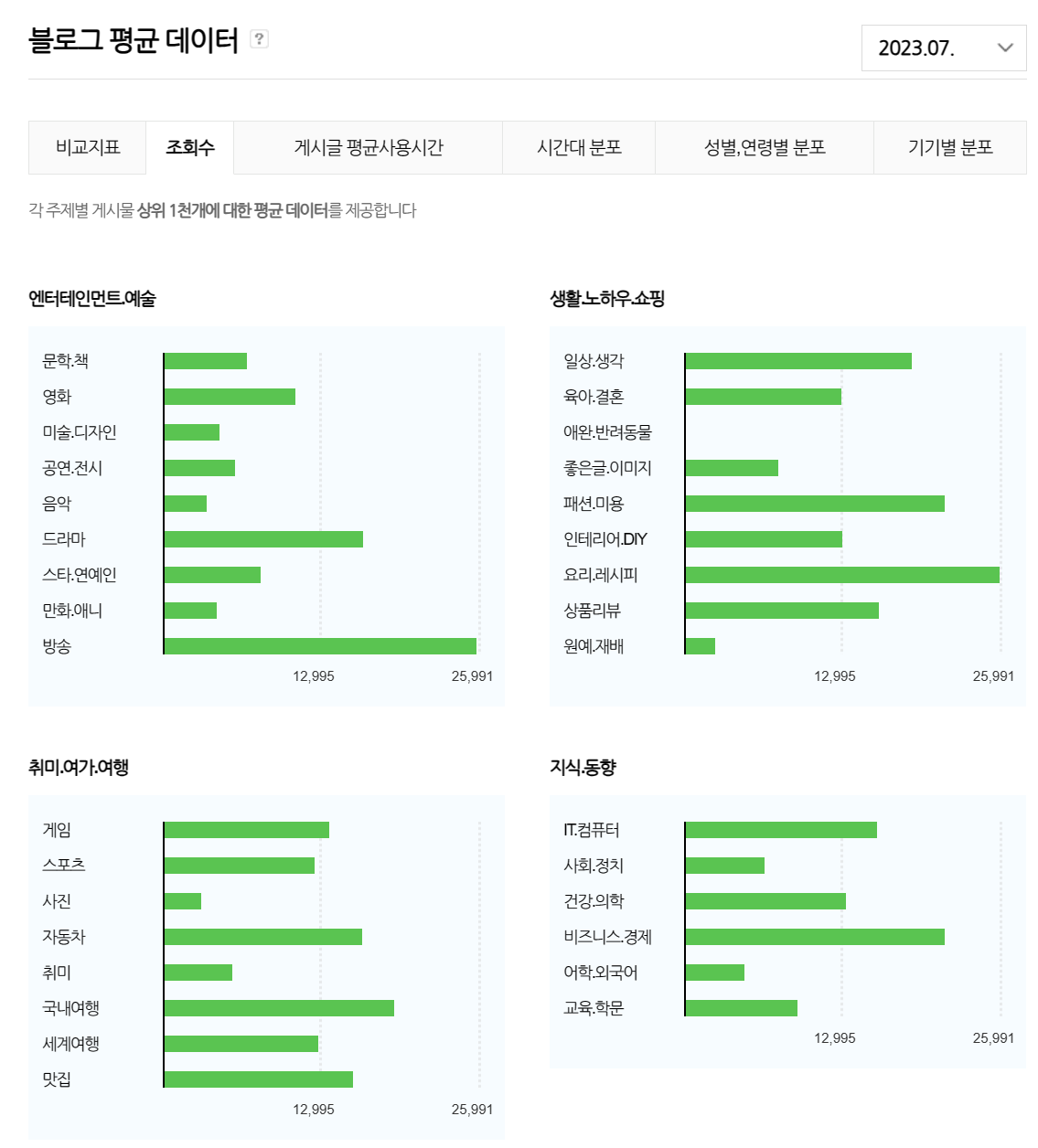 분석방법은 간단하다. 네이버 블로그 평균 데이터 페이지에 가면 다음과 같이 데이터를 제공해준다. 조회수의 경우 각 소주제별로 대략적인 수치를 막대그래프와 함께 보여주는데 주제별로 디테일한 숫자는 제공되지 않기 때문에 이를 임의로 4등분하여 점수화했다.