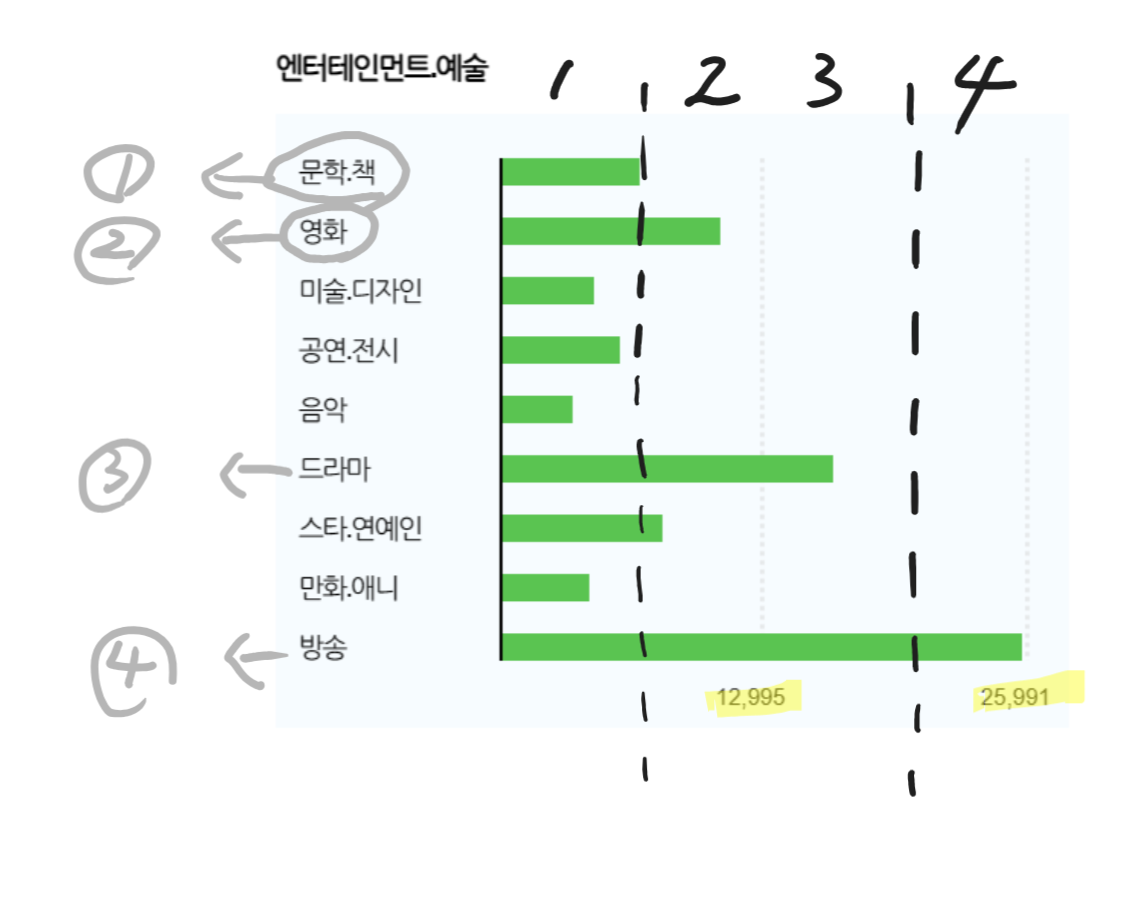 예를 들면, 위 그림은 23년 7월 기준 엔터테인먼트, 예술 분야의 소주제별 조회수 데이터인데 각 소주제별로 디테일한 숫자를 알 수 없기에 크게 4등분하여 1점부터 4점까지 점수를 부여하였다. 문학, 책의 경우 1점, 영화의 경우 2점, 드라마의 경우 3점, 방송의 경우 4점을 획득하는 것이다. 물론, 8등분하면 조금 더 디테일하게 구분이 가능하겠지만 귀찮아서 4등분만 했다.